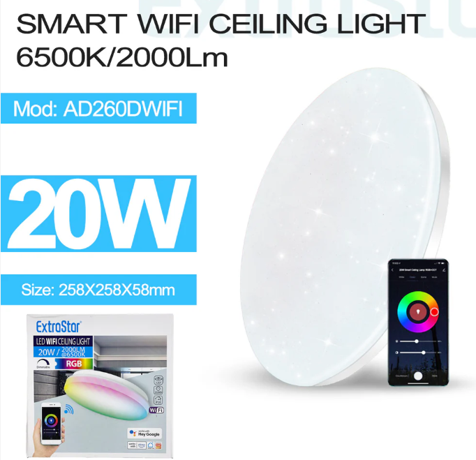 The ExtraStar Smart WiFi Ceiling Light (Model: AD260DWIFI) offers 20W of power and 2000 lumens of brightness. With built-in WiFi, it can be controlled via...