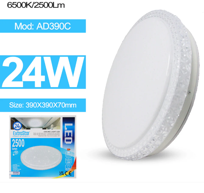 ExtraStar 24W Round LED Ceiling Light (Model: AD390C) features a decorative acrylic crystal edge, delivering 2500 lumens of brightness at 6500K cool white. Its sleek...