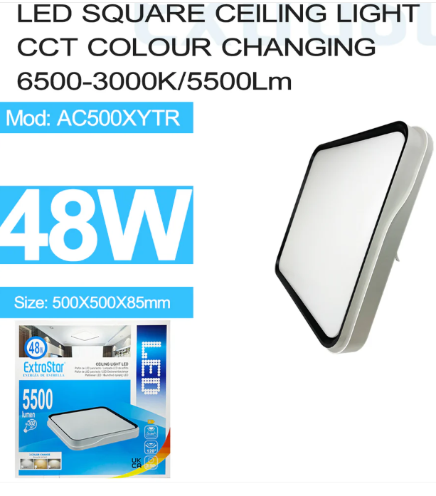 The ExtraStar 48W LED Square Ceiling Light (Model: AC500XYTR) features adjustable CCT with a 3-color change option, providing 5500 lumens of brightness. Designed for versatility,...